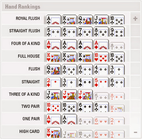 Disini kami akan menjelaskan Nilai kartu tertinggi akan kalah dengan kombinasi kartu, “One Pair”. “One Pair” kalah dengan “Two Pair”, “Two Pair” kalah dengan “Three of a Kind”, “Three of a Kind” kalah dengan “Straight”, “Straight” kalah dengan “Flush”, “Flush” kalah dengan “Full House”, “Full House” kalah dengan “Four of a Kind”, “Four of a Kind” kalah dengan “Straight Flush”, dan”Straight Flush” kalah dengan “Royal Flush”. Royal Flush merupakan nilai tertinggi dalam permainan Poker.